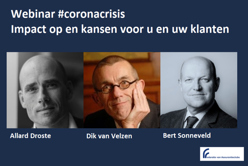Op woensdagmiddag 6 mei 2020 organiseert de Federatie van Assurantieclubs van 15–16u een webinar over hoe de coronacrisis impact heeft op en kansen biedt voor jou en je klanten. Ook als je geen lid bent van een assurantieclub die bij de Federatie is aangesloten kun je je aanmelden om de uitzending te bekijken.