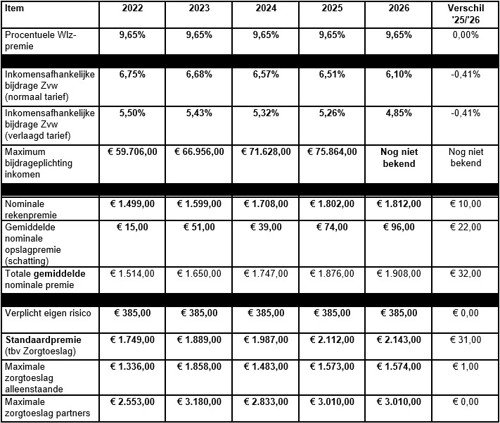 - De Standaardpremie wordt gebruikt voor de berekening van de Zorgtoeslag. De Standaardpremie stijgt in 2026 met € 31 (€ 25 in 2025 en € 98 in 2024). De maximale zorgtoeslag voor een alleenstaande stijgt met € 1 per jaar per 2026, de maximale zorgtoeslag voor partners blijft gelijk op basis van deze cijfers.