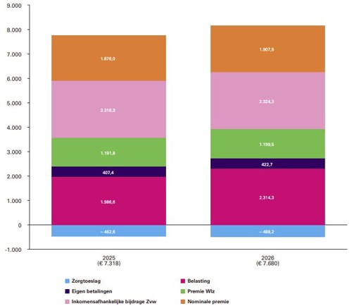 - De inkomensafhankelijke bijdrage (regulier tarief) daalt met 0,41% naar 6,10%. Het is het vijfde jaar op rij dat de inkomensafhankelijke bijdrage naar beneden wordt bijgesteld (vanaf 2021). De nominale premie en de inkomensafhankelijke bijdrage worden altijd in de verhouding 50/50 vastgesteld. Omdat in praktijk de premievaststelling door verzekeraars meestal afwijkt van wat VWS begroot, wordt er meestal een correctie voor het voorgaande jaar ingebouwd. In eerdere jaren is er verhoudingsgewijs te veel inkomensafhankelijke bijdrage geheven. Voor het rechttrekken van de onderlinge verhouding is een correctie van 0,08% ingebouwd in de inkomensafhankelijke bijdrage. Totaal is het verschil tussen inkomensafhankelijke bijdrage en nominale premie in 2026 € 3,1 miljard wat er te veel aan inkomensafhankelijke bijdrage is binnengekomen. Het is de bedoeling om dit overschot in vier jaar weg te werken, te beginnen in 2026.