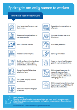 Begin april hebben we de eerste versie van een protocol voor financieel advies op 1,5 meter afstand gepubliceerd, Sindsdien hebben zowel de coronacrisis als de formele procedures rondom een corona-protocol zich verder ontwikkeld. We hebben het protocol geactualiseerd. Ook hebben we leaflets/infographics gemaakt om medewerkers en klanten makkelijk te informeren.