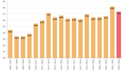 Het overstappercentage per 2024 ligt lager dan de 8,2% van 2023, toen de collectiviteitskorting op de basisverzekering werd afgeschaft. Maar het percentage is wel hoger dan het overstappercentage van alle overige eerdere jaren sinds de Zorgverzekeringswet is ingegaan per 2006: