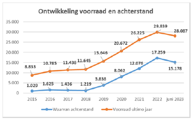 Deze grafiek geeft de ontwikkeling van de achterstand bij de WIA-claimbeoordeling weer. Er is sprake van een achterstand bij aanvragen waarvan de wettelijke termijn van 8 weken is verstreken. De totale werkvoorraad is het aantal aanvragen binnen de wettelijke termijn plus de achterstand. Hoewel er inderdaad sprake lijkt te zijn van een afname, zijn de werkvoorraden bij het UWV nog steeds erg groot.