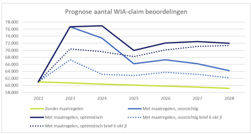 Het ministerie van SZW schrijft over deze daling: “Ook voor 2025 is de verwachting dat UWV nog steeds een hoger aantal WIA-claimbeoordelingen kan doen, maar minder hoog dan de piek in 2023 en 2024. Dat komt doordat in 2025 het effect van de 60-plusmaatregel wegvalt. Daarnaast wordt in de berekeningen alleen rekening gehouden met overwerkeffecten tot 1 juli 2024, omdat de overwerkafspraken tot die datum gelden.” Dit lijkt te impliceren dat de 60-plusmaatregel per 2025 komt te vervallen, maar de kans bestaat dat de maatregel toch weer zal worden verlengd.