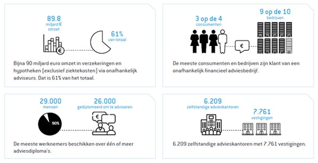 Driekwart van de consumenten en negen van de tien bedrijven in Nederland zijn klant van een onafhankelijk financieel adviesbedrijf. Onafhankelijk financieel adviseurs zijn jaarlijks verantwoordelijk voor de bemiddeling bij bijna 90 miljard euro aan verzekeringen en hypotheken. Dat is 61% van het totaalvolume. Samen bieden de ruim 6000 bedrijven met meer dan 7500 vestigingen een fijnmazig netwerk en houden ze advies dichtbij.